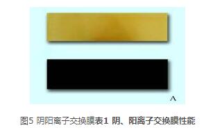 陽膜為苯乙烯系磺酸型均相陽離子交換膜(JCM-Ⅱ)(圖5A下);陰膜為苯乙烯季銨型均相陰離子交換膜(JAM-Ⅱ) (圖5A上);我公司自主研發生產。在外加直流電場力的作用下,陰膜只讓陰離子通過而阻擋陽離子,陽膜只讓陽離子通過而阻擋陰離子,它們具有耐強酸、強堿,柔韌度強,機械強度高,使用壽命長等特點。各膜性能指標如下: